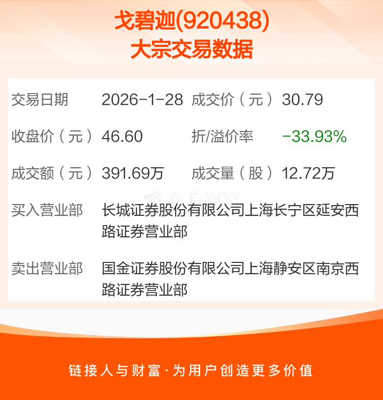 大宗交易:戈碧迦成交391.69万元,折价33.93%(1-28)