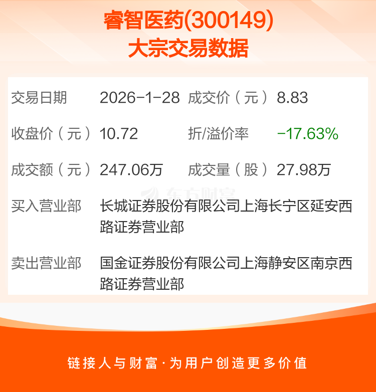 大宗交易:睿智医药成交247.06万元,折价17.63%(1-28)