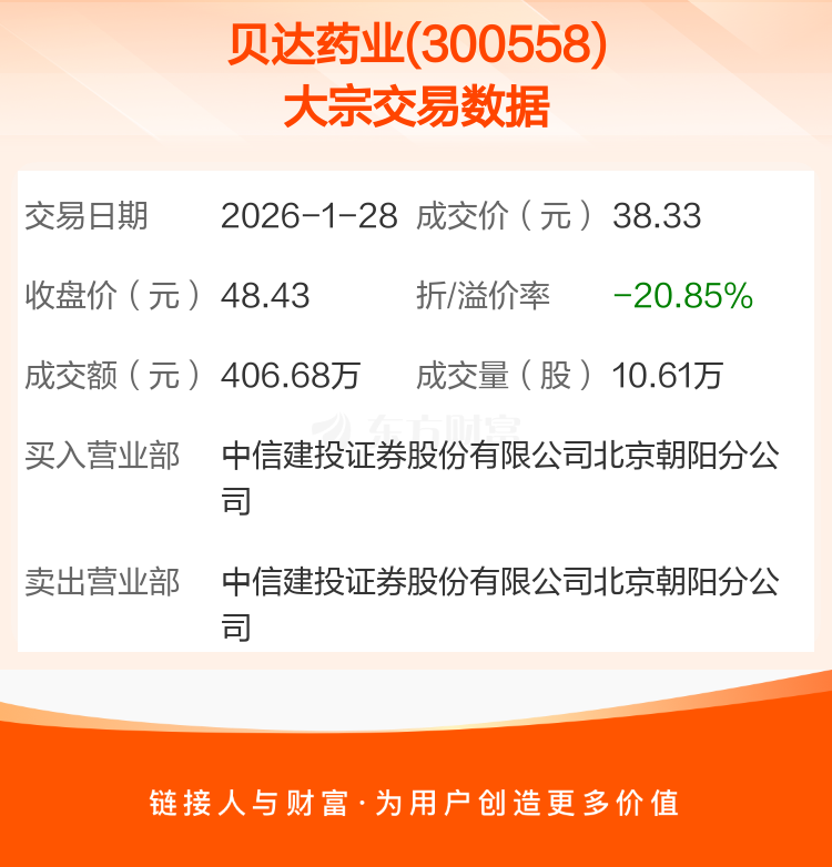 2026年1月28日,贝达药业发生1笔大宗交易,共成交10.61万股,成交金额406.68万元,占其流通市值比例为0.02%。