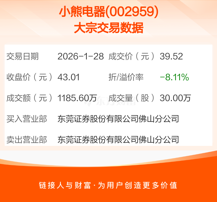 2026年1月28日,小熊电器发生1笔大宗交易,共成交30.00万股,成交金额1185.60万元,占其流通市值比例为0.18%。