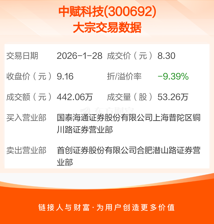 2026年1月28日,中赋科技发生1笔大宗交易,共成交53.26万股,成交金额442.06万元,占其流通市值比例为0.12%。