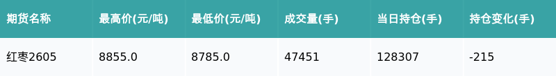 南财智讯1月28日电,盘后期货数据显示,郑州商品交易所的红枣主力合约收跌0.06%,收盘报8830.0元/吨,日内资金流出55.19万元。其他相关指标见下表: