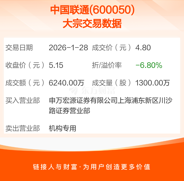 2026年1月28日,中国联通发生1笔大宗交易,共成交1300.00万股,成交金额6240.00万元,占其流通市值比例为0.04%。