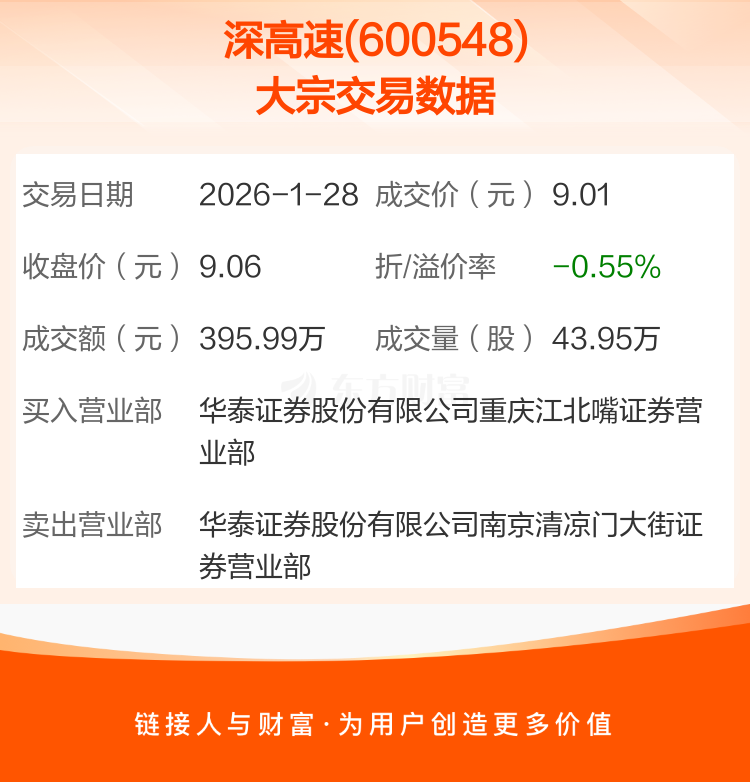 2026年1月28日,深高速发生1笔大宗交易,共成交43.95万股,成交金额395.99万元,占其流通市值比例为0.03%。
