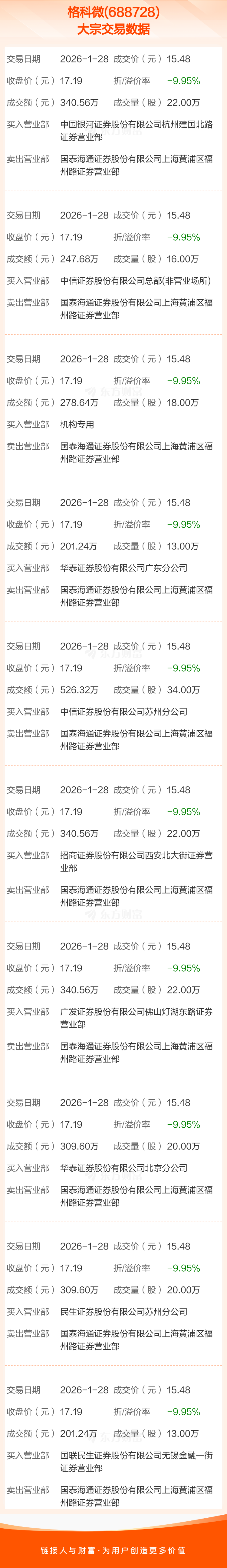 2026年1月28日,格科微发生10笔大宗交易,共成交200.00万股,成交金额3096.00万元,占其流通市值比例为0.07%。