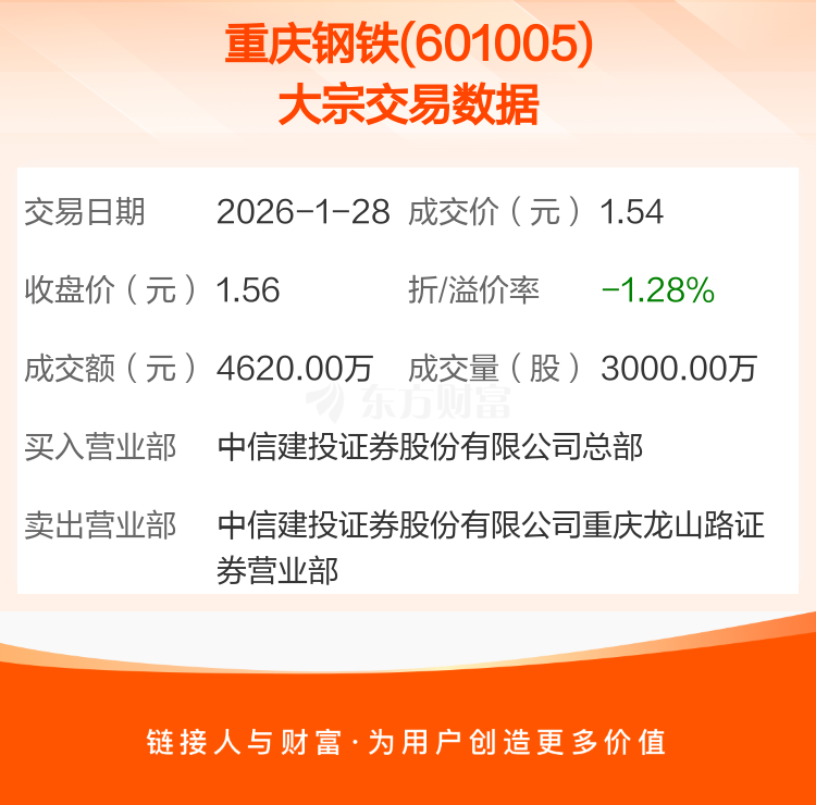 2026年1月28日,重庆钢铁发生1笔大宗交易,共成交3000.00万股,成交金额4620.00万元,占其流通市值比例为0.36%。
