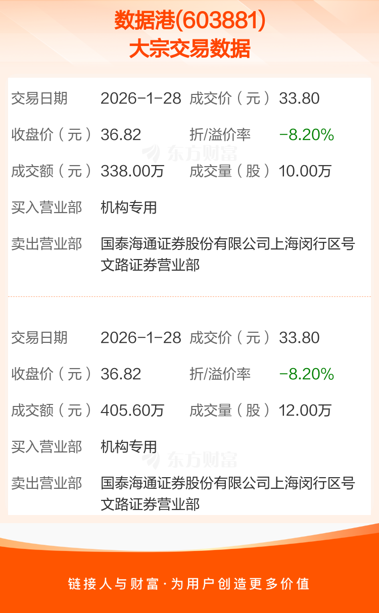 2026年1月28日,数据港发生2笔大宗交易,共成交22.00万股,成交金额743.60万元,占其流通市值比例为0.03%。