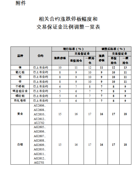 黄金期货AU2606、AU2608、AU2610、AU2612、AU2702合约涨跌停板幅度调整为16%,套保持仓交易保证金比例调整为17%,一般持仓交易保证金比例调整为18%;