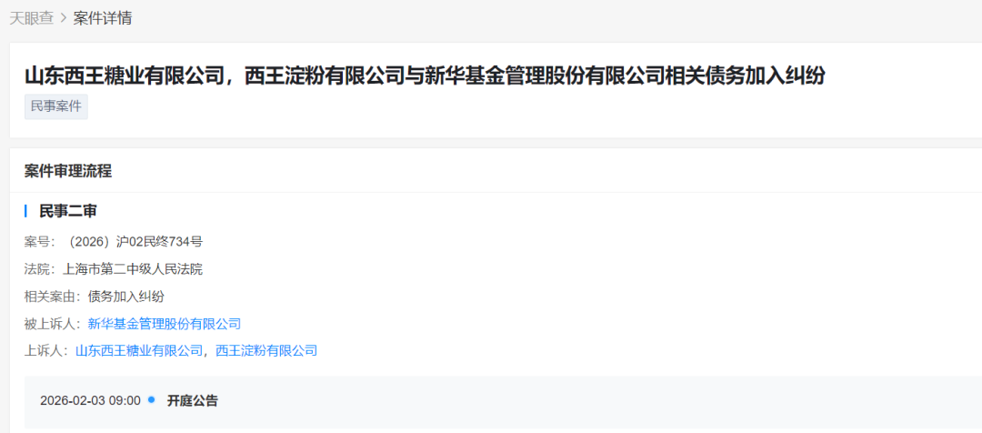 天眼查信息显示,近日,山东西王糖业有限公司、西王淀粉有限公司起诉新华基金,缘由是债务加入纠纷,该民事案件将于2月3日在上海市第二中级人民法院开庭。