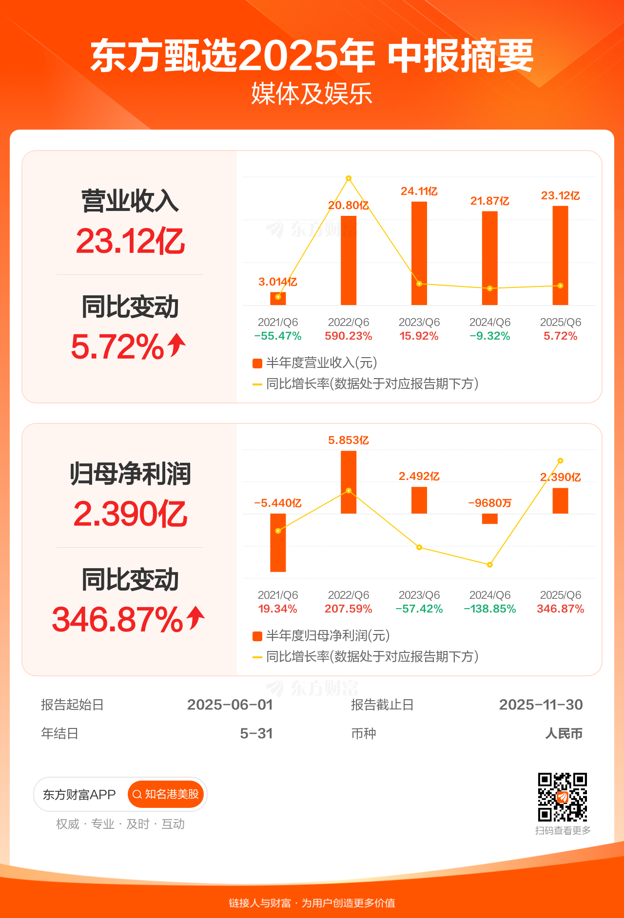 东方甄选1月28日发布中期业绩,截至2025年11月30日的6个月内,该公司营业收入23.12亿人民币,同比增长5.72%;公司权益持有人应占溢利(归母净利润)2.39亿人民币,同比增长346.87%。