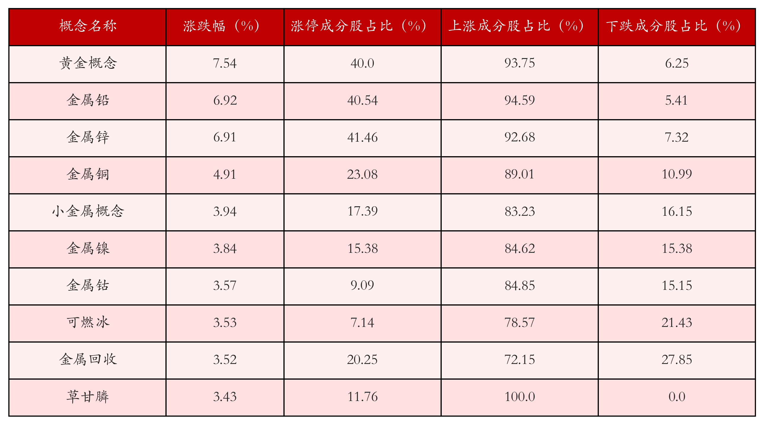 根据A股概念涨跌幅与所对应的股票池综合分析,涨幅靠前的三个概念板块分别为:黄金概念、金属铅与金属锌。排名前10位的概念板块相关数据见下表: