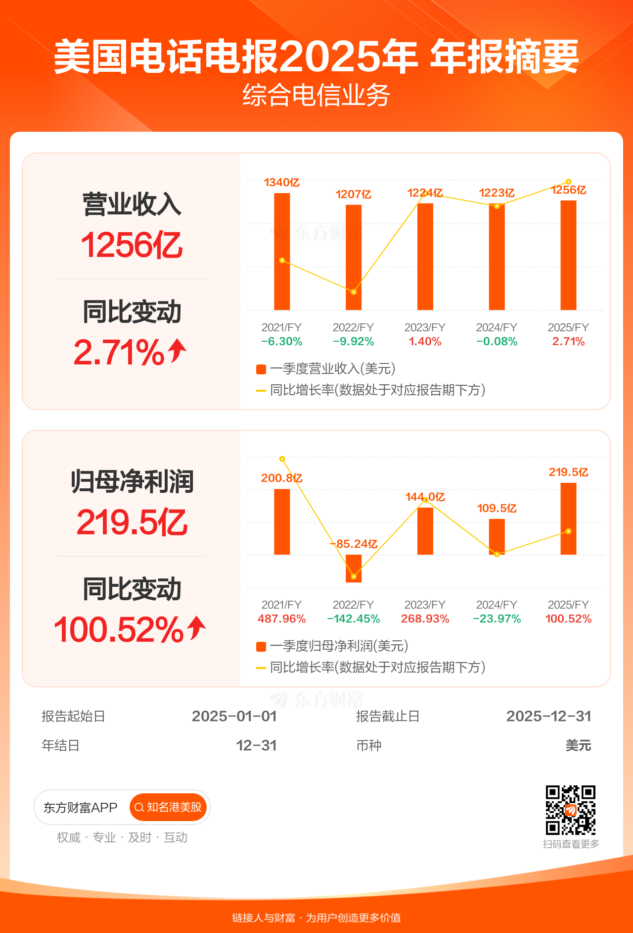 美国电话电报1月28日发布年报业绩,截至2025年12月31日的12个月内,该公司营业收入1256.48亿美元,同比增长2.71%;公司权益持有人应占溢利(归母净利润)219.53亿美元,同比增长100.52%。