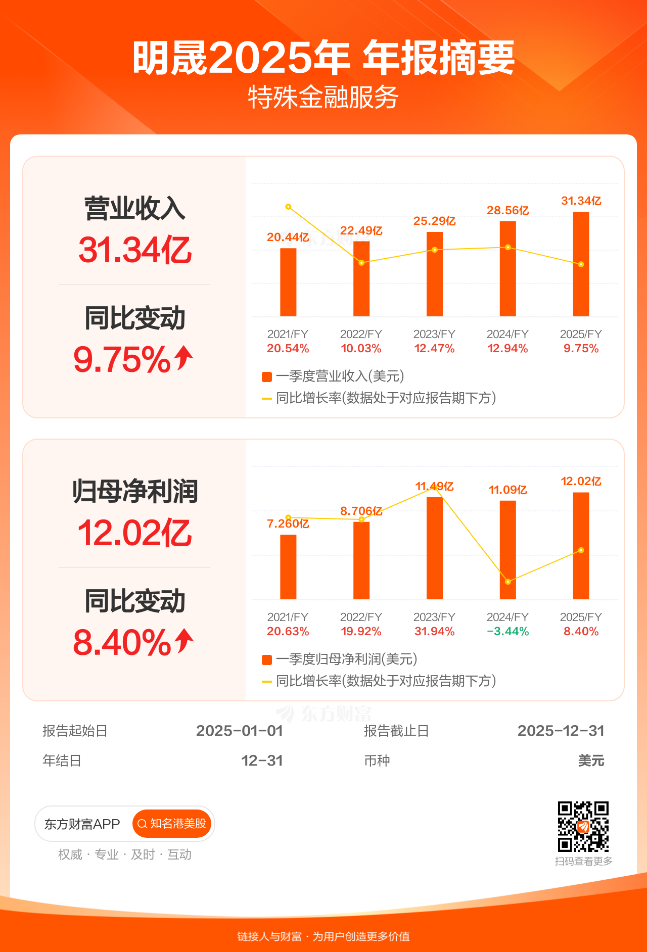 明晟1月28日发布年报业绩,截至2025年12月31日的12个月内,该公司营业收入31.34亿美元,同比增长9.75%;公司权益持有人应占溢利(归母净利润)12.02亿美元,同比增长8.40%。