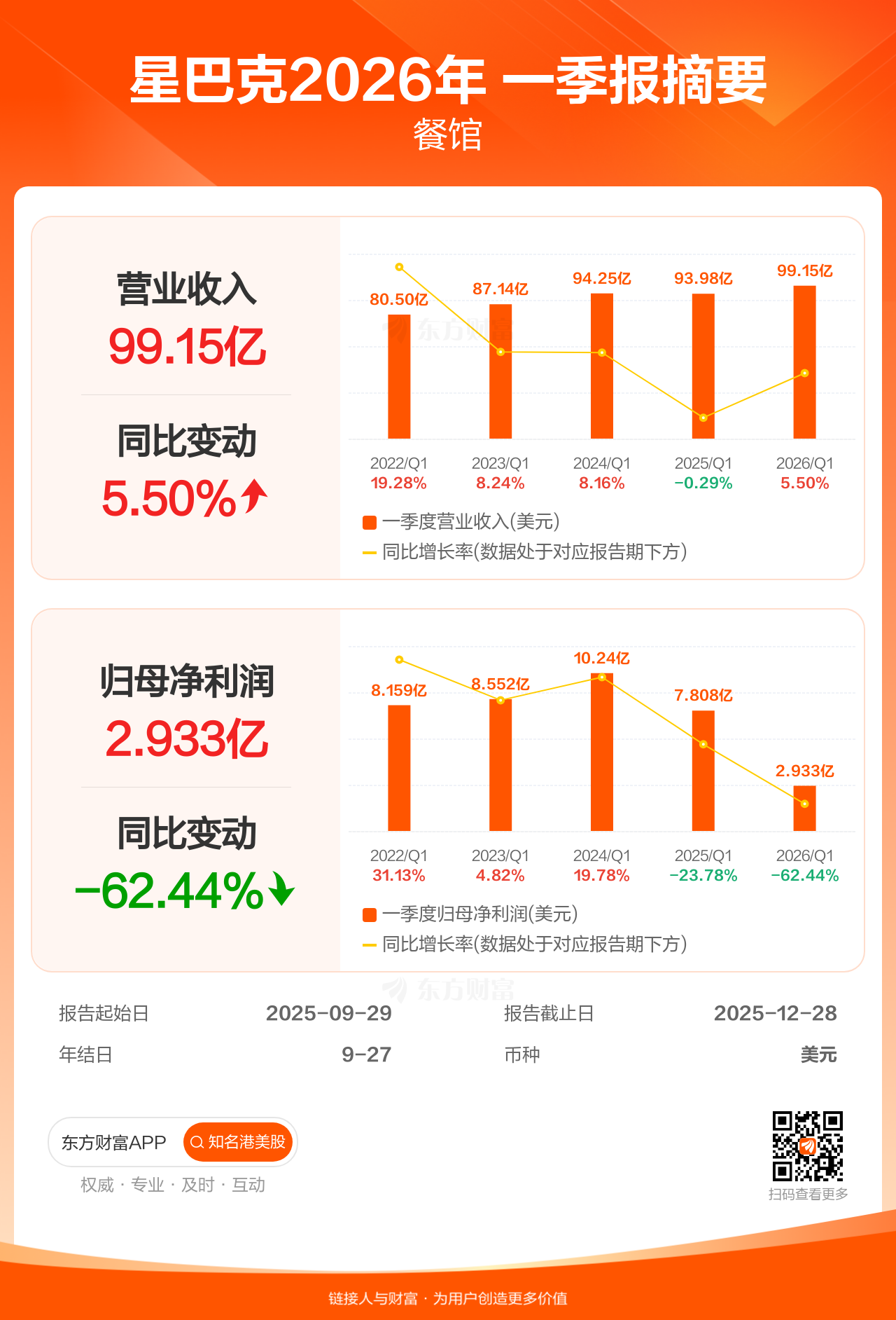 星巴克1月28日发布一季报业绩,截至2025年12月28日的3个月内,该公司营业收入99.15亿美元,同比增长5.50%;公司权益持有人应占溢利(归母净利润)2.93亿美元,同比减少62.44%。