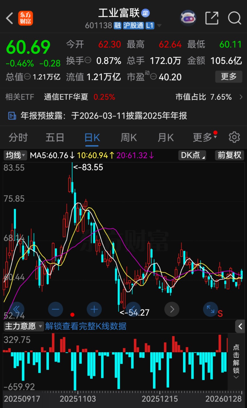 截至1月28日收盘,工业富联股价报60.69元/股,跌幅达0.46%,总市值为1.21万亿元。