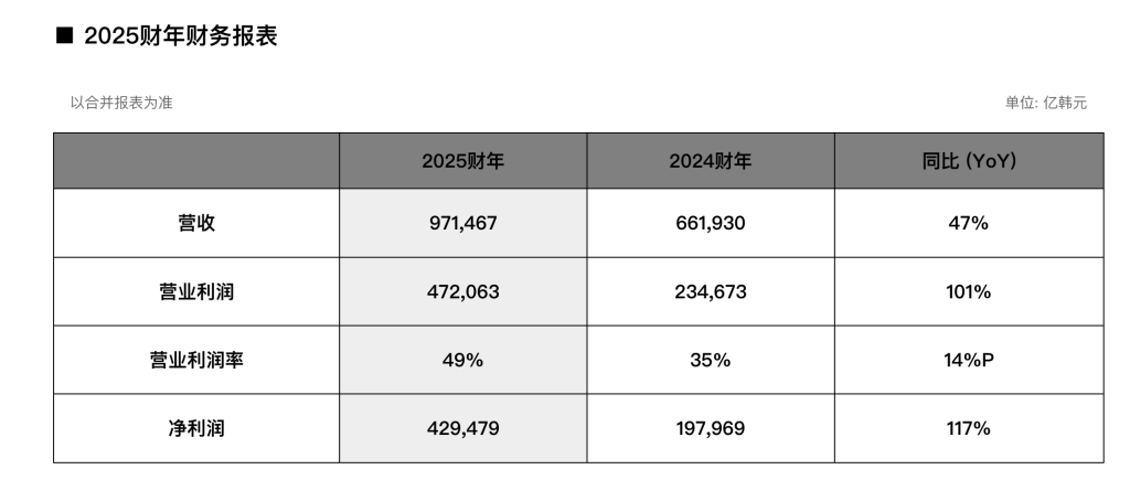 1月28日,存储芯片厂商海力士发布了截至2025年12月31日的2025财年及第四季度财务报告。海力士全年营收为97.1467万亿韩元(约合679亿美元),同比增长了47%;营业利润为47.2063万亿韩元(约合330亿美元),同比增长了101%,营业利润率为49%;净利润为42.9479万亿韩元(约合300亿美元),增长117%,净利润率为44%。