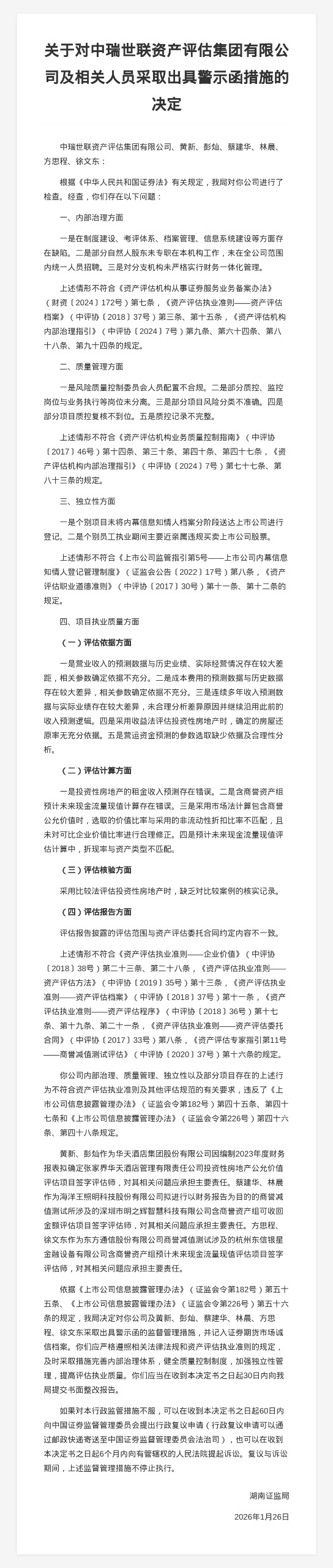 对此,湖南证监局决定对中瑞世联资产评估集团有限公司及黄新、彭灿、蔡建华、林晨、方思程、徐文东采取出具警示函的监督管理措施,并记入证券期货市场诚信档案。