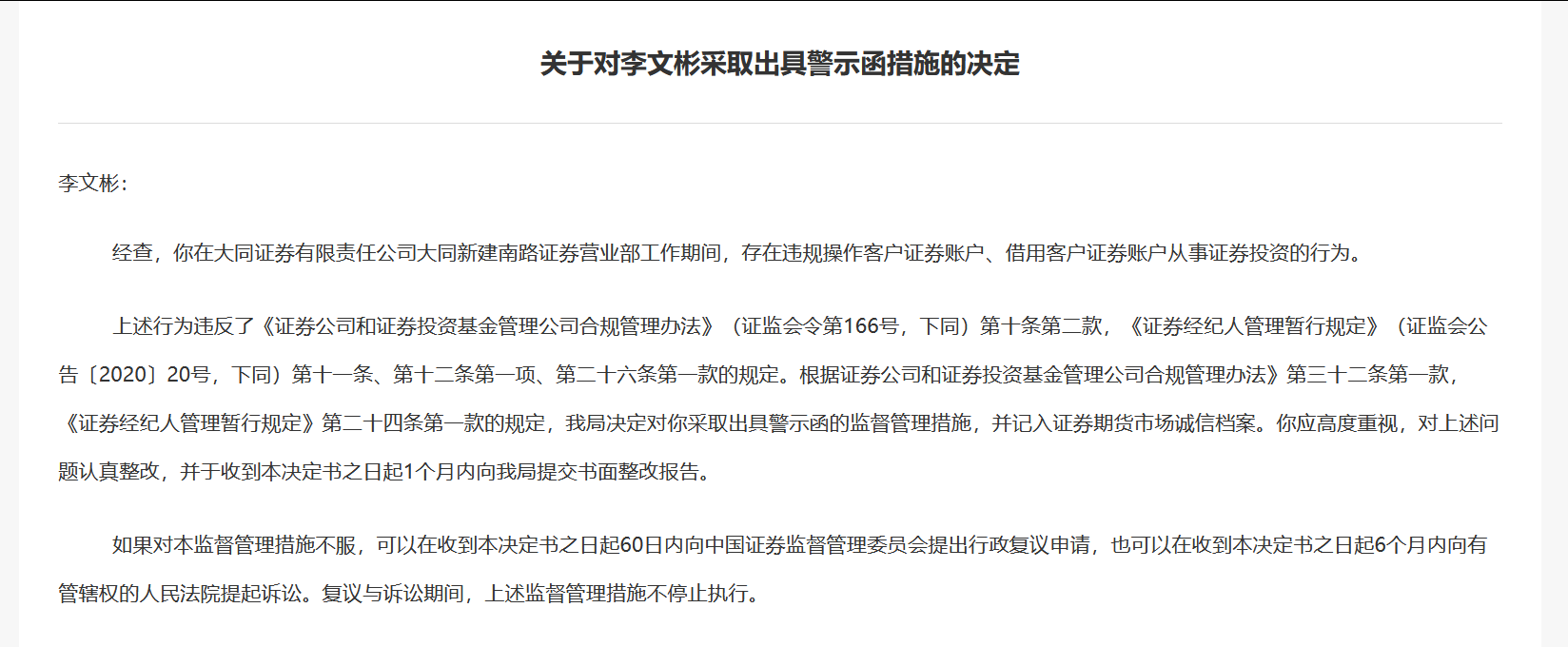 违规操作客户账户,借用客户账户投资!大同证券员工李文彬收警示函