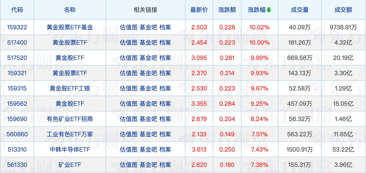 具体来看,资源股全天领涨,中国黄金4连板,湖南黄金3连板,黄金股ETF继续走强,6只产品涨幅超过9%。