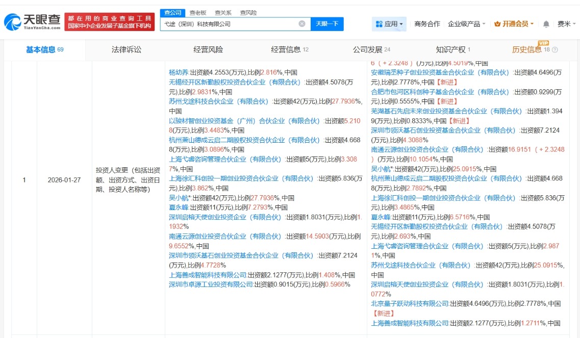 南方财经1月28日电,天眼查工商信息显示,近日,弋途(深圳)科技有限公司发生工商变更,新增字节跳动旗下北京量子跃动科技有限公司、芜湖基石先启未来创业投资基金合伙企业(有限合伙)等为股东,同时,注册资本由约151万人民币增至约167万人民币。弋途(深圳)科技有限公司成立于2023年10月,法定代表人为吴小航,经营范围包括汽车零部件及配件制造、智能车载设备制造、智能车载设备销售等。股东信息显示,该公司现由吴小航、苏州戈途科技合伙企业(有限合伙)及上述新增股东等共同持股。公开资料显示,该公司致力于汽车行业基础中间件、服务中间件、AI中间件的研发和商业化落地。