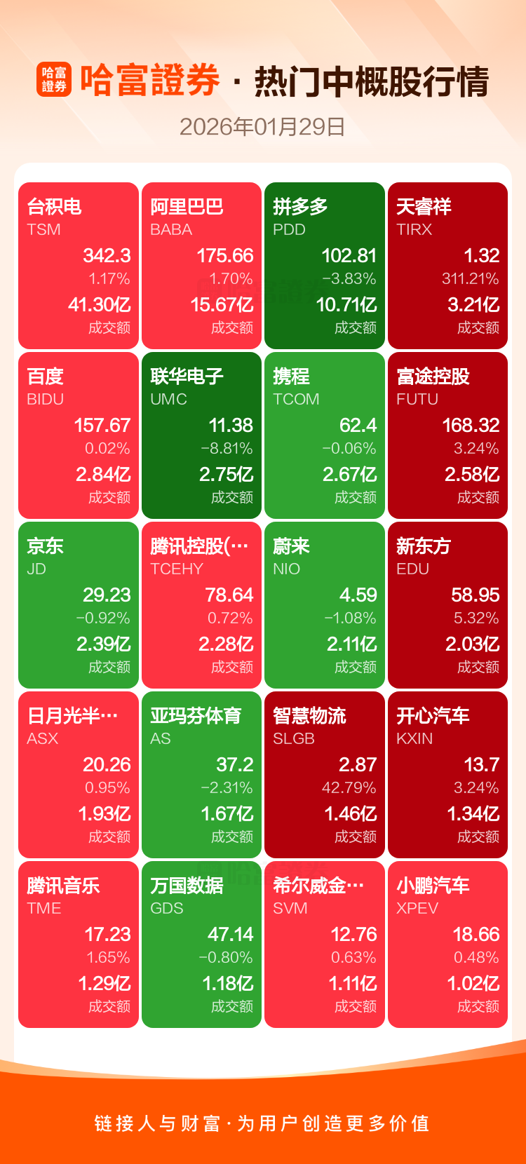 台积电涨1.17%,阿里巴巴涨1.70%,拼多多跌3.83%,天睿祥涨311.21%,百度涨0.02%,联华电子跌8.81%,携程跌0.06%,富途控股涨3.24%,京东跌0.92%,腾讯控股(ADR)涨0.72%。