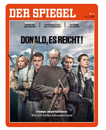 封面图上展示了五位欧洲领导人的照片,德国总理默茨、法国总统马克龙、欧盟委员会主席冯德莱恩、丹麦首相弗雷泽里克森和意大利总理梅洛尼,他们被画成身穿猎人服装,手持武器的形象,背后背景看似是格陵兰岛冰川。
