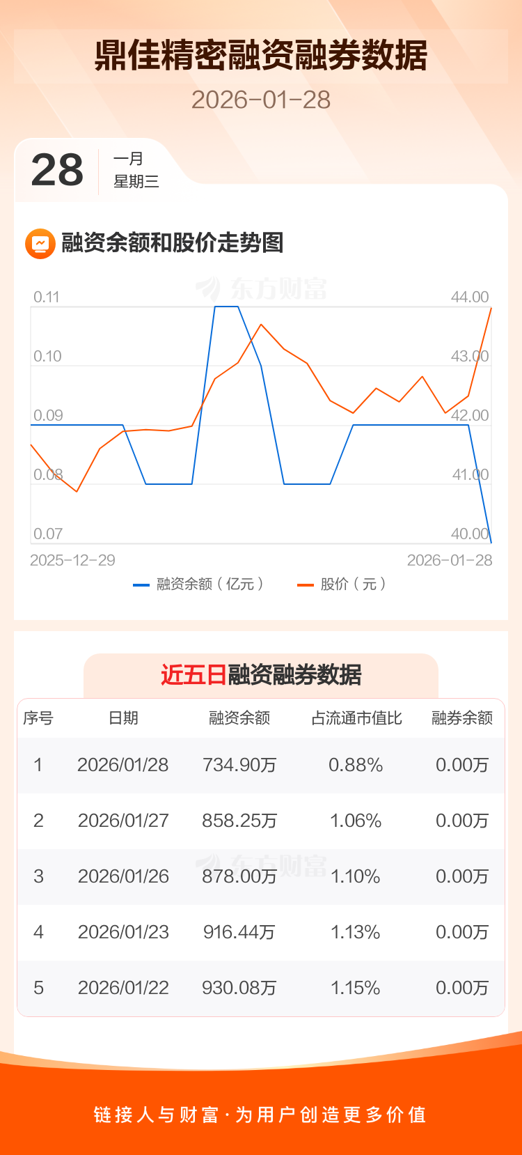 交易所最新数据显示,鼎佳精密于2026年1月28日获融资买入50.99万元,融资偿还174.34万元,当日融资净偿还123.35万元。目前,该股融资余额734.90万,占流通市值比例为0.88%。