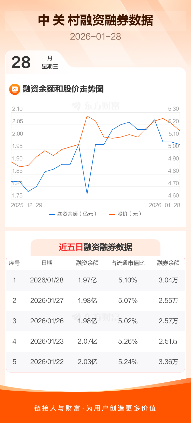 交易所最新数据显示,中 关 村于2026年1月28日获融资买入338.00万元,融资偿还438.87万元,当日融资净偿还100.87万元。目前,该股融资余额1.97亿,占流通市值比例为5.10%。