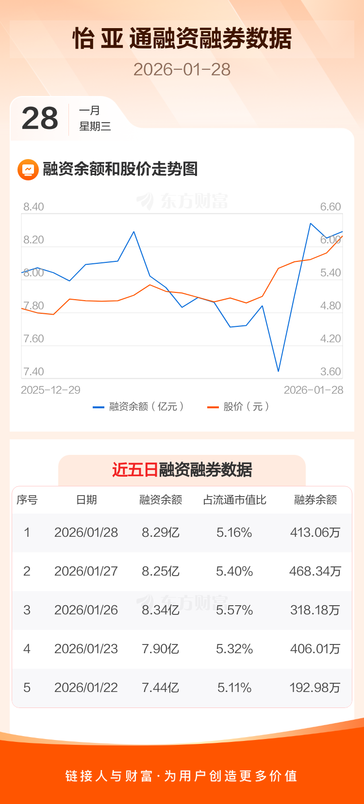 交易所最新数据显示,怡 亚 通于2026年1月28日获融资买入1.69亿元,融资偿还1.65亿元,当日融资净买入406.06万元。目前,该股融资余额8.29亿,占流通市值比例为5.16%。