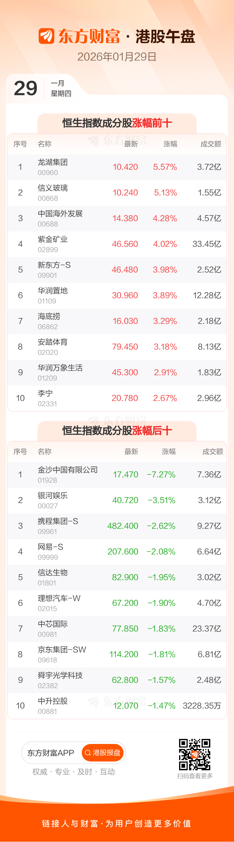 港股1月29日午盘走高,恒生指数收报27975.81点,涨148.9点,涨幅0.54%;恒生科技指数收报5860.66点,跌39.5点,跌幅0.67%。恒生指数成分股中龙湖集团、信义玻璃、中国海外发展涨幅居前,金沙中国有限公司、银河娱乐、携程集团-S跌幅靠前。恒生科技指数成分股中小米集团-W、快手-W、金山软件涨幅居前,蔚来-SW、华虹半导体、地平线机器人-W跌幅靠前。