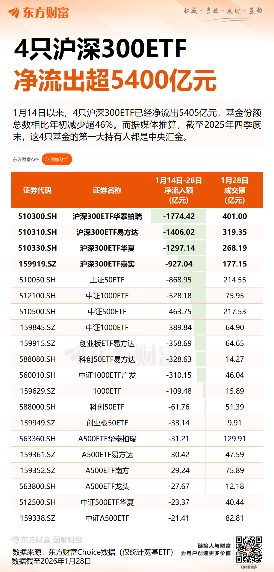 Wind数据显示,1月28日,华泰柏瑞基金、易方达基金、华夏基金、嘉实基金旗下沪深300ETF合计净流出超970亿元,今年以来合计净流出超5400亿元,基金份额总数相比年初减少超46%。