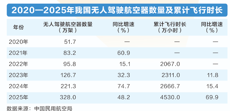 从应用端同样可以窥见低空经济的持续繁荣。近些年来,我国无人机数量爆发式增长,低空飞行市场持续活跃。根据中国民航局数据,2025年,我国实名登记无人机总数突破328万架,较2020年的51.7万架大幅增长534.4%;累计飞行时长4530万小时,较2022年的飞行时长已实现翻倍增长。