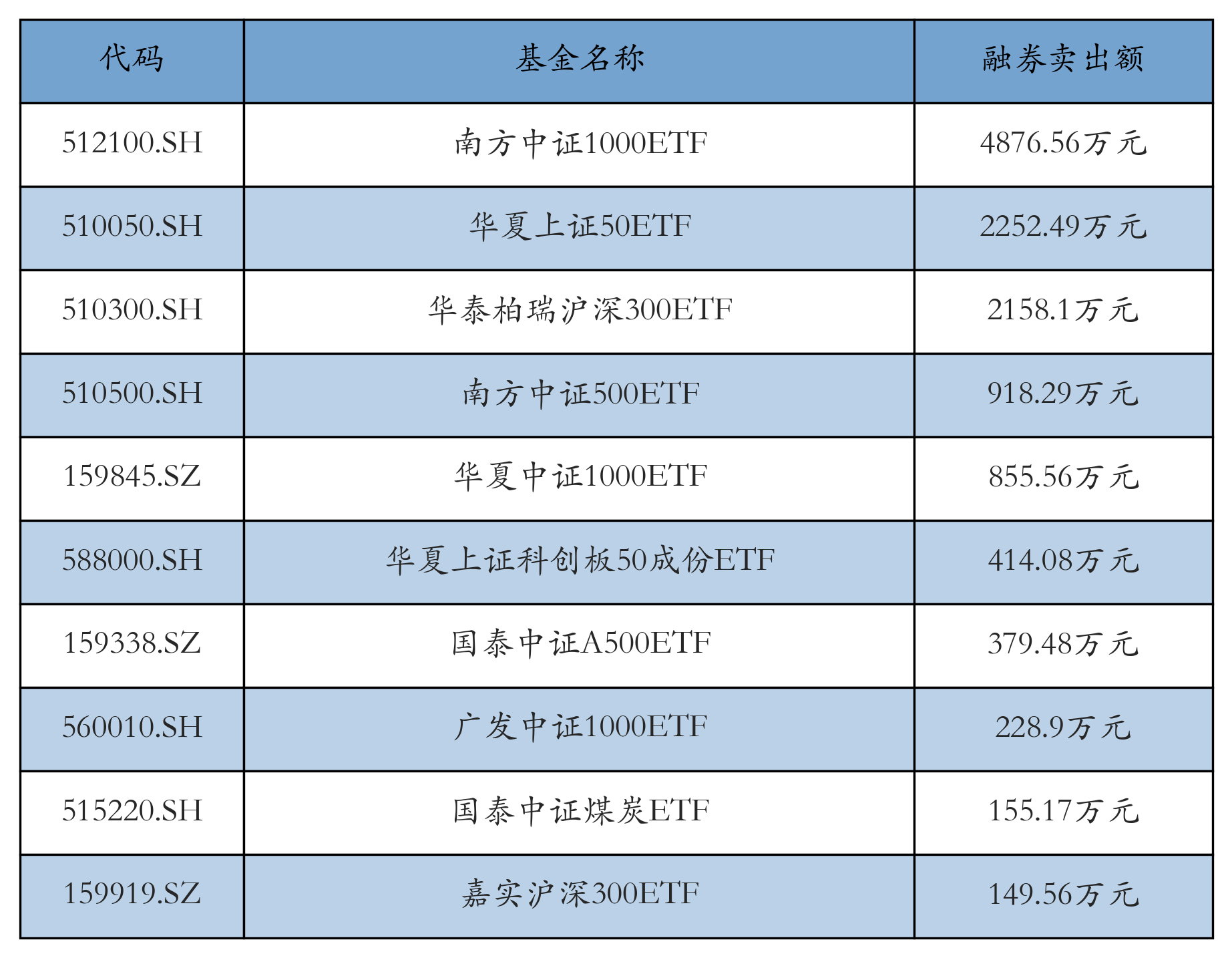 1月28日ETF融券卖出额前三位分别为:南方中证1000ETF(4876.56万元)、华夏上证50ETF(2252.49万元)和华泰柏瑞沪深300ETF(2158.1万元),前10具体见下表:
