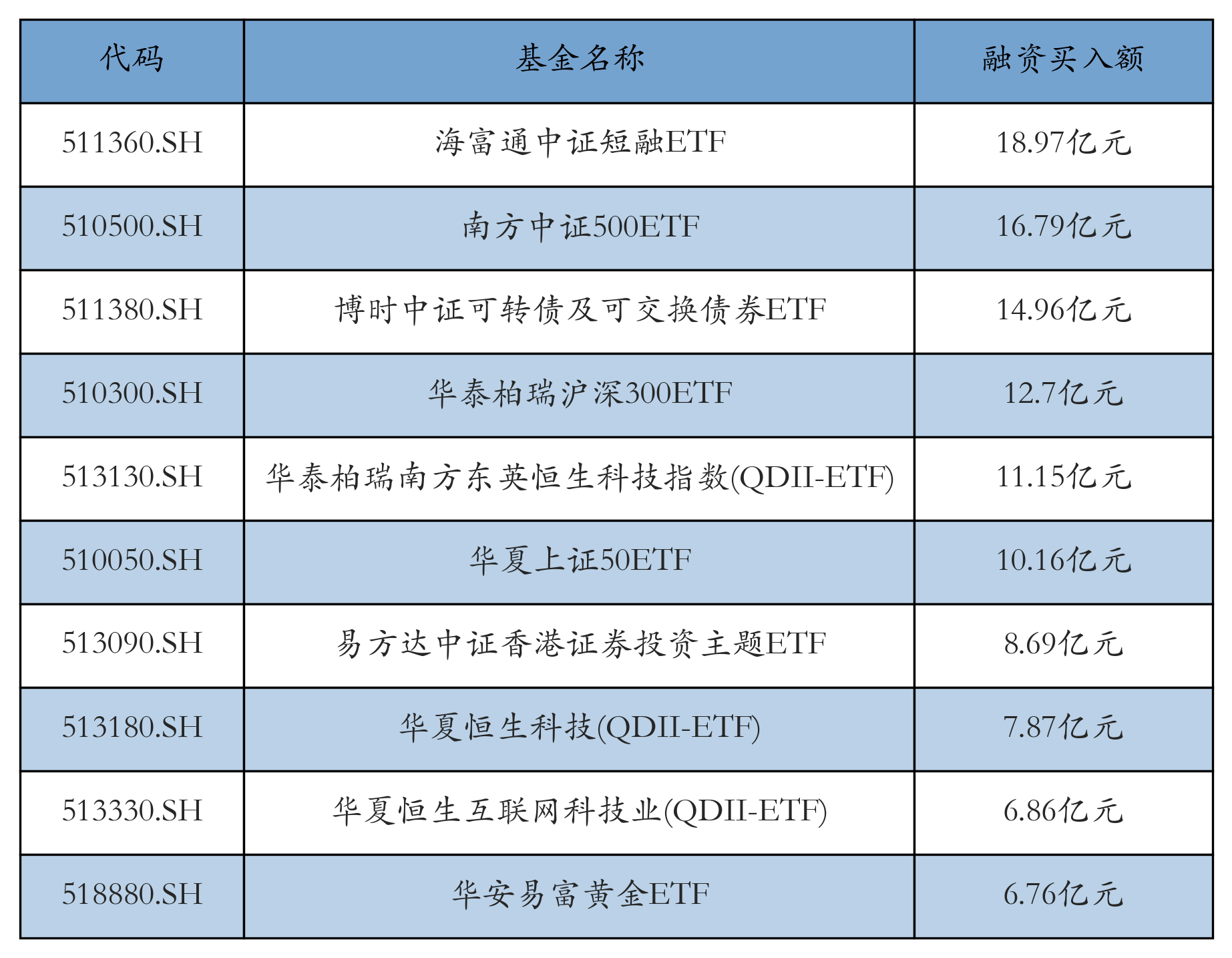 1月28日ETF融资买入额前三位分别为:海富通中证短融ETF(18.97亿元)、南方中证500ETF(16.79亿元)和博时中证可转债及可交换债券ETF(14.96亿元),前10具体见下表: