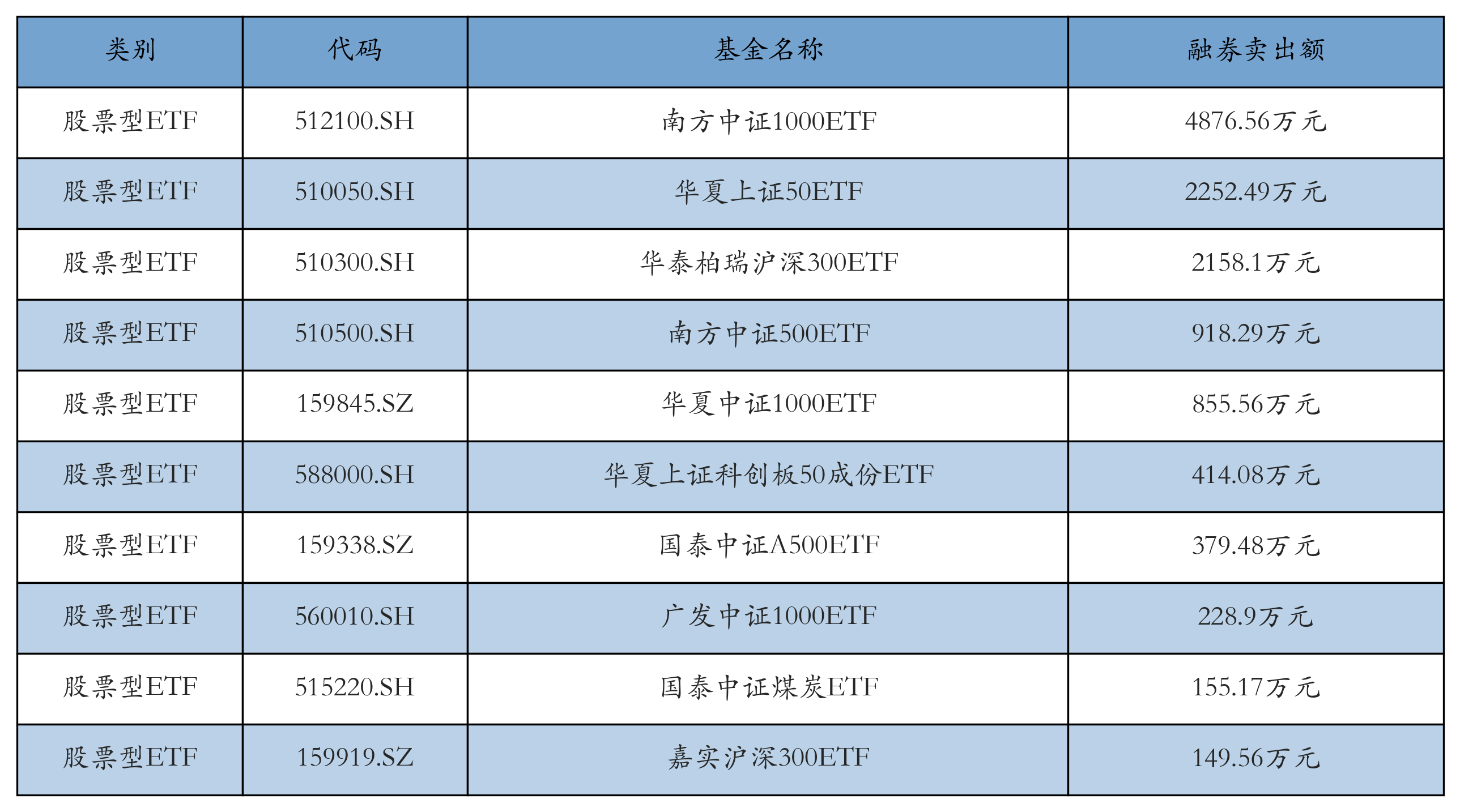 昨日股票型ETF融资卖出额最高的3只ETF及其卖出金额分别为:南方中证1000ETF(4876.56万元)、华夏上证50ETF(2252.49万元)、华泰柏瑞沪深300ETF(2158.1万元)。融券卖出额前10详情见下表: