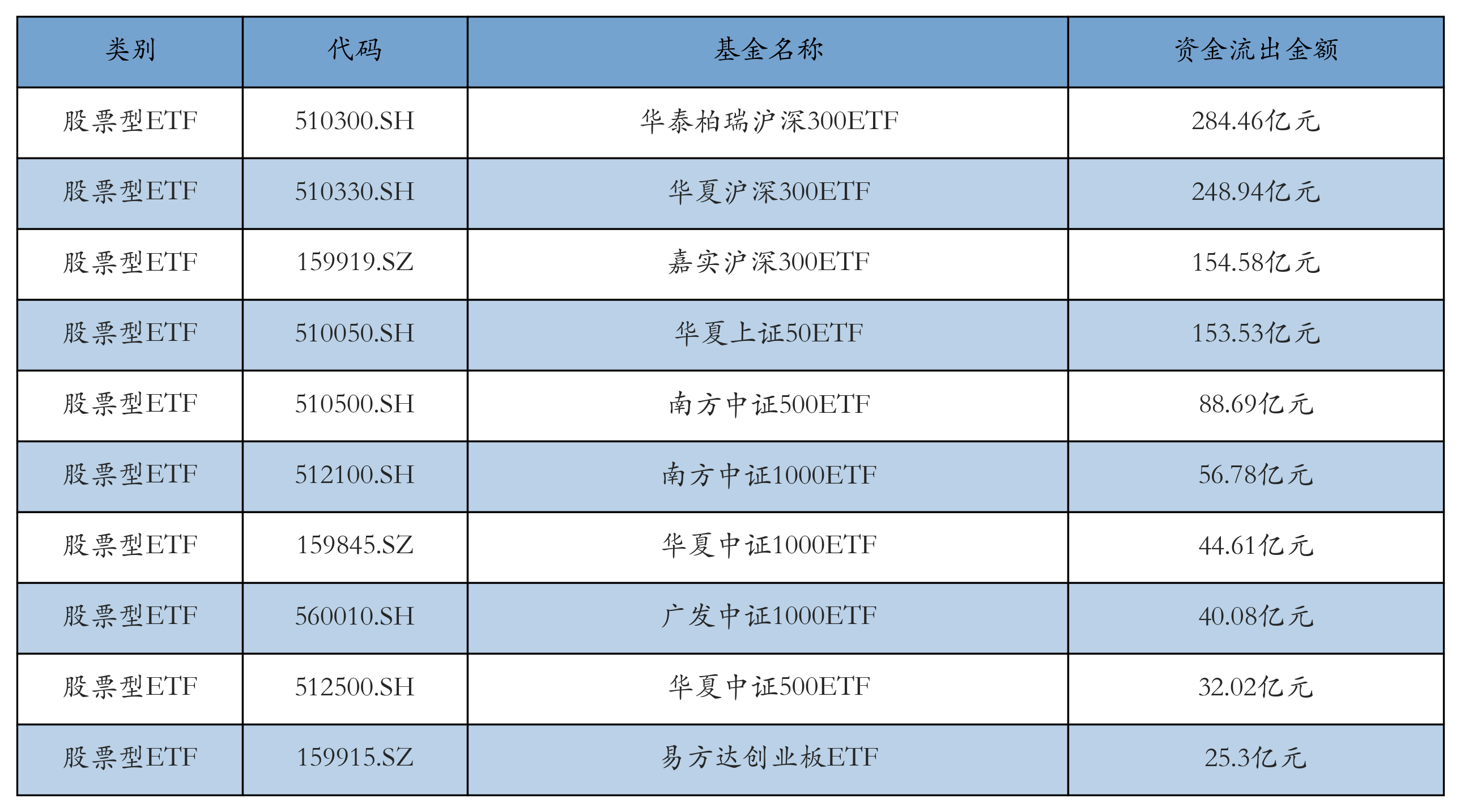 昨日股票型ETF资金流出最多的3只ETF及其流出金额分别为:华泰柏瑞沪深300ETF(流出284.46亿元)、华夏沪深300ETF(流出248.94亿元)、嘉实沪深300ETF(流出154.58亿元)。资金流出前10详情见下表: