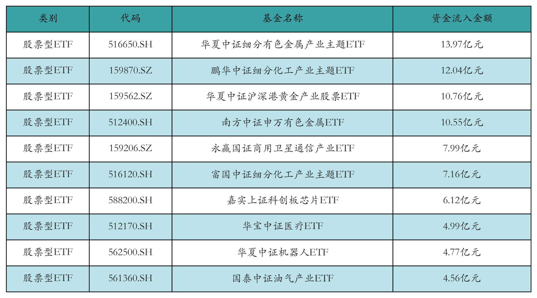 昨日股票型ETF资金流入最多的3只ETF及其流入金额分别为:华夏中证细分有色金属产业主题ETF(流入13.97亿元)、鹏华中证细分化工产业主题ETF(流入12.04亿元)、华夏中证沪深港黄金产业股票ETF(流入10.76亿元)。资金流入前10详情见下表:
