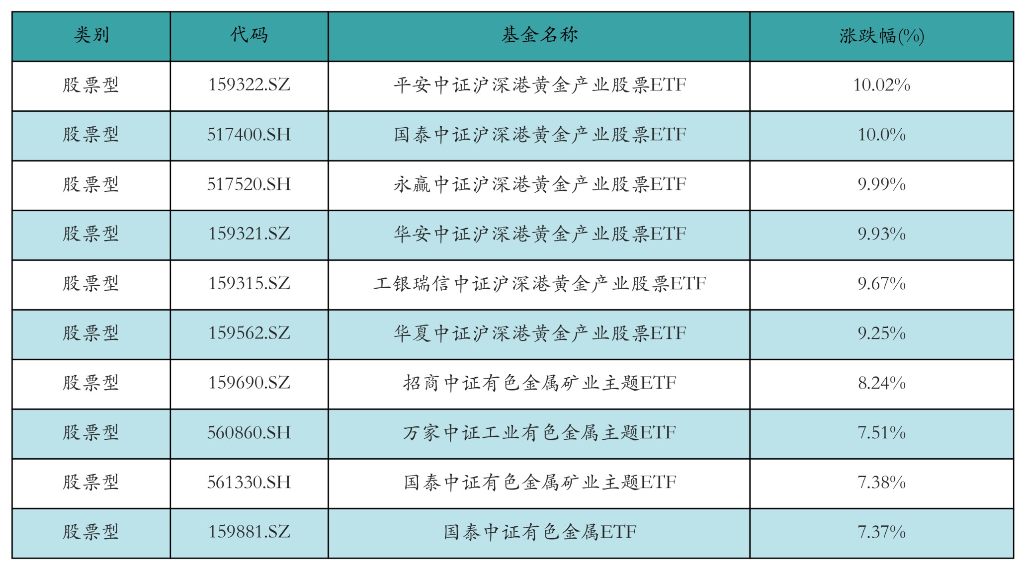 昨日股票型ETF涨幅最高的3只ETF及其收益率分别为:平安中证沪深港黄金产业股票ETF(10.02%)、国泰中证沪深港黄金产业股票ETF(10.0%)、永赢中证沪深港黄金产业股票ETF(9.99%)。涨幅前10详情见下表: