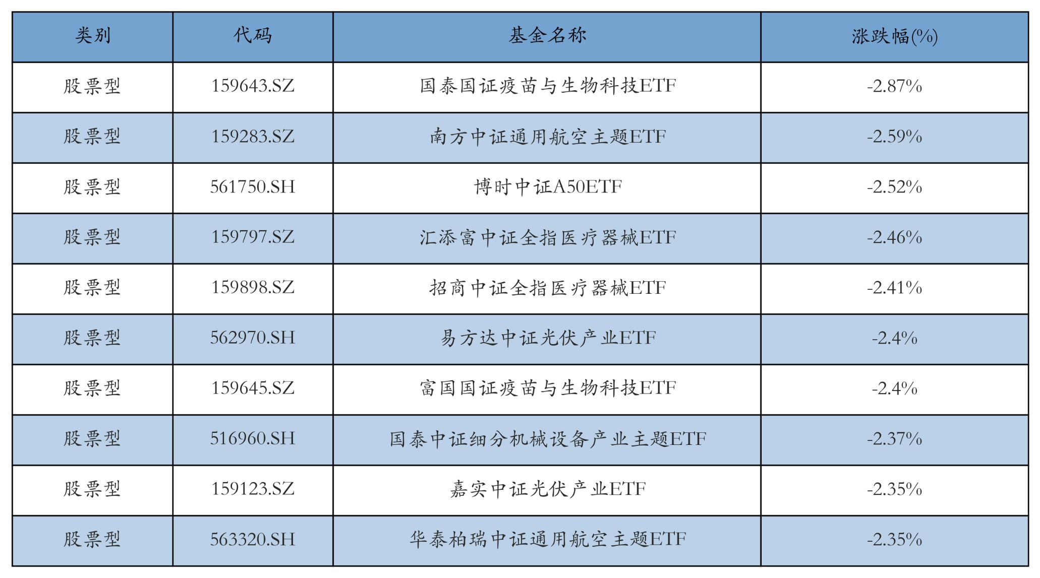 昨日股票型ETF跌幅最大的3只ETF及其收益率分别为:国泰国证疫苗与生物科技ETF(-2.87%)、南方中证通用航空主题ETF(-2.59%)、博时中证A50ETF(-2.52%)。跌幅前10详情见下表:
