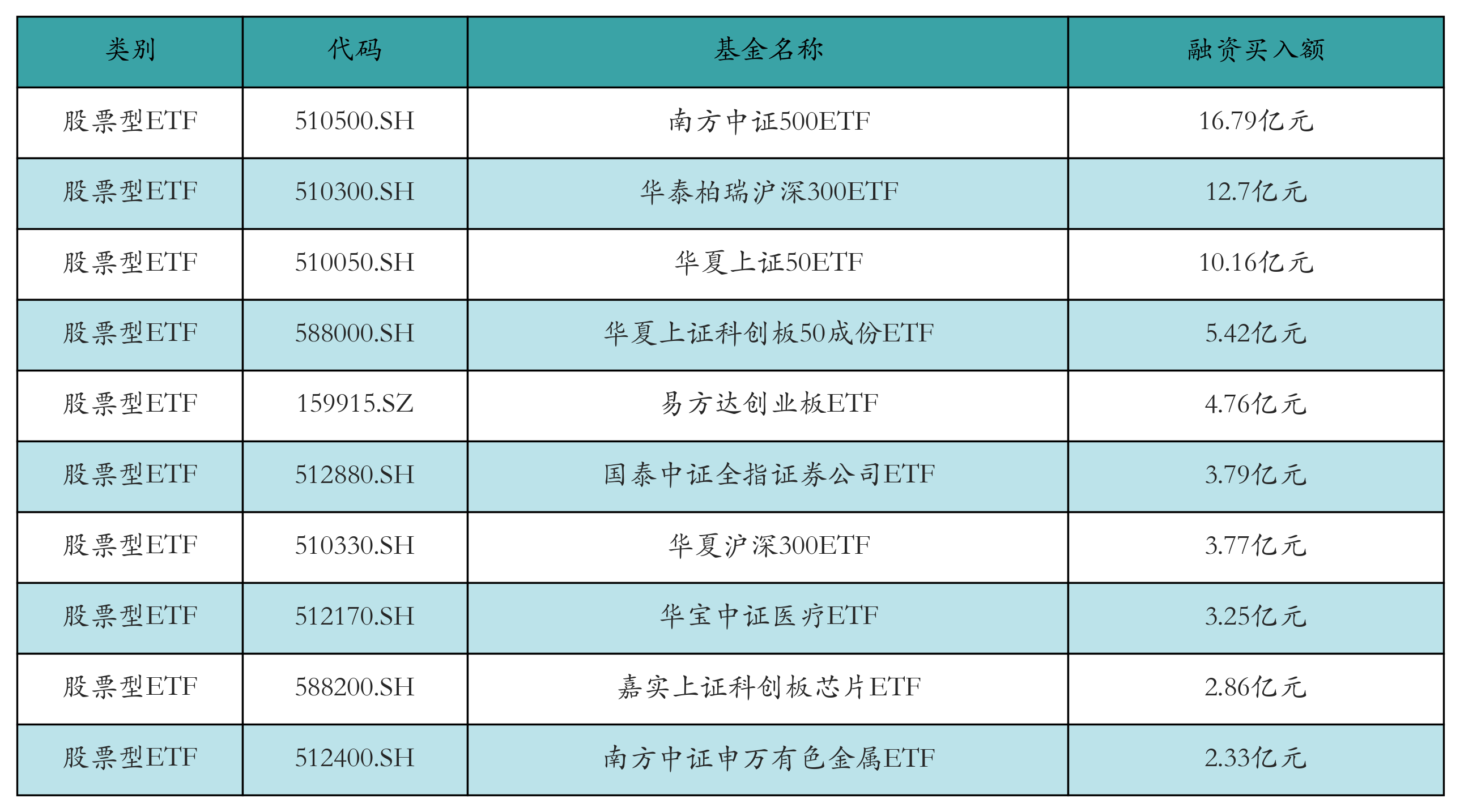 昨日股票型ETF融资买入额最高的3只ETF及其买入金额分别为:南方中证500ETF(16.79亿元)、华泰柏瑞沪深300ETF(12.7亿元)、华夏上证50ETF(10.16亿元)。融资买入额前10详情见下表: