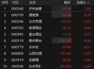 上证报中国证券网讯 1月29日午后,白酒板块震荡反弹,截至13时17分,泸州老窖涨超7%,酒鬼酒涨逾6%,贵州茅台、古井贡酒、水井坊、舍得酒业等涨幅靠前。