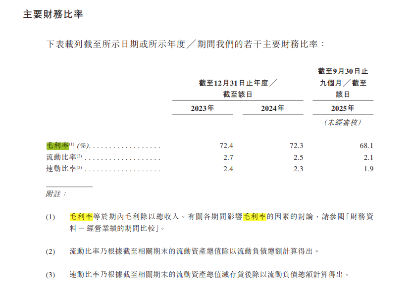 公司5款商业化产品中,已有4款纳入国家医保目录 。进入医保虽然保证了销量的快速增长,但代价是价格的下滑。招股书显示,公司的毛利率从2023年的72.4%下降至2025年前三季度的68.1% 。这一趋势直接反映了医保降价和产品结构变化对盈利能力的影响。