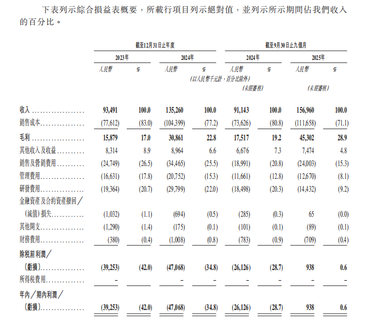 据招股书,2023年、2024年及2025年前九个月,阿童木机器人的研发开支分别为1936.4万元(人民币,下同)、2979.9万元、1443.2万元;公司营收分别为9349.1万元、1.35亿元、1.57亿元;净利润分别为-3925.3万元、-4706.8万元、93.8万元。阿童木机器人表示,公司在2025年前九个月实现了盈利,并保持良好的增长态势,这是其在可持续盈利路径上的关键里程碑。