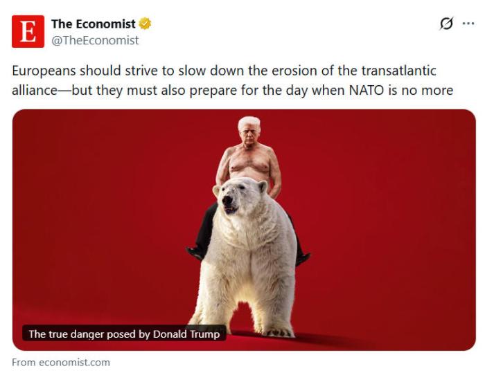 围绕近期欧美紧张关系,英国《经济学人》也于近日发布了一张图片,图上特朗普裸露上身、骑熊而来。