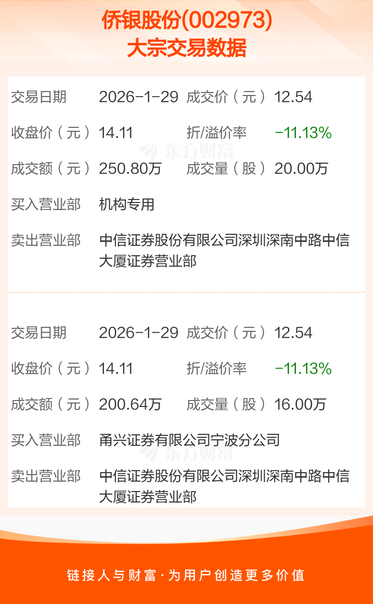 大宗交易:侨银股份成交451.44万元,折价11.13%(1-29)