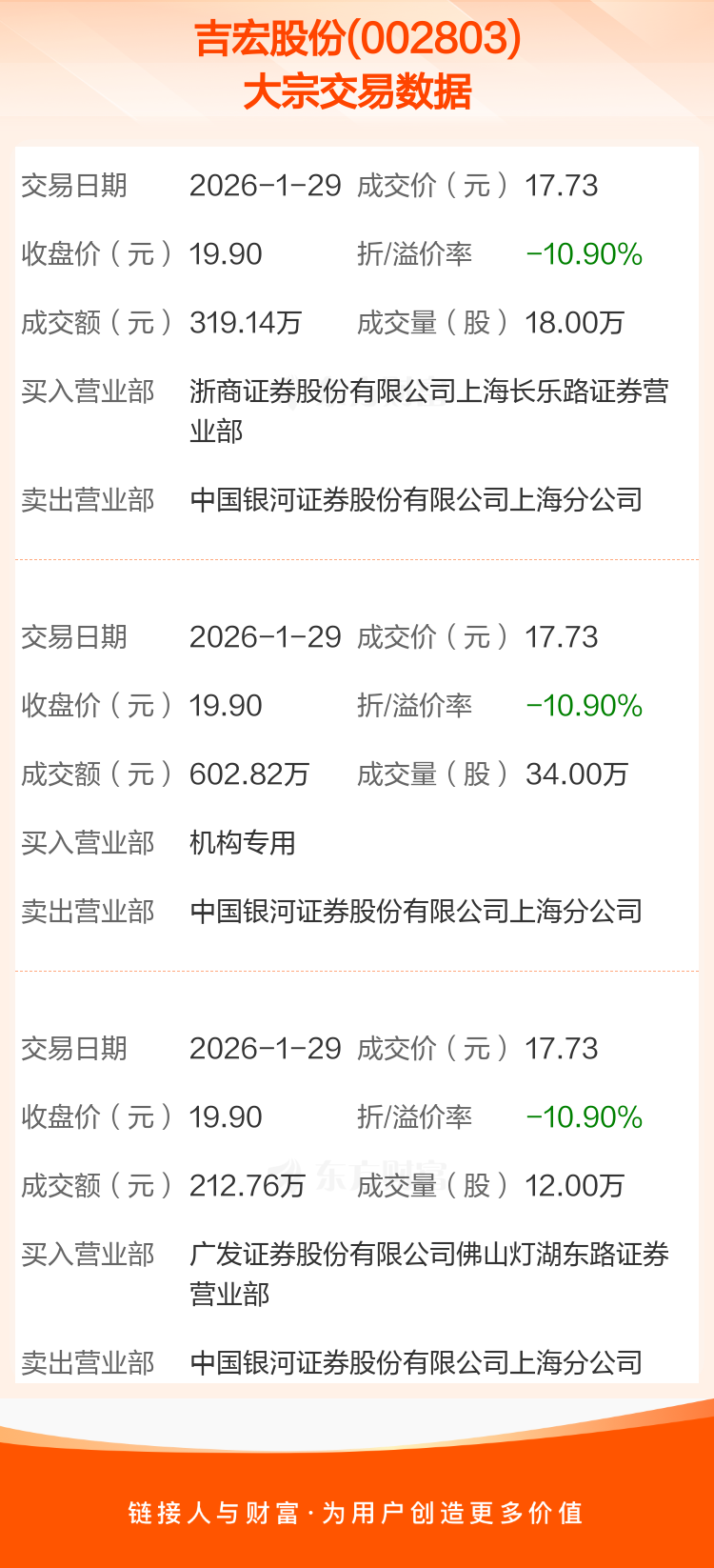 2026年1月29日,吉宏股份发生3笔大宗交易,共成交64.00万股,成交金额1134.72万元,占其流通市值比例为0.20%。