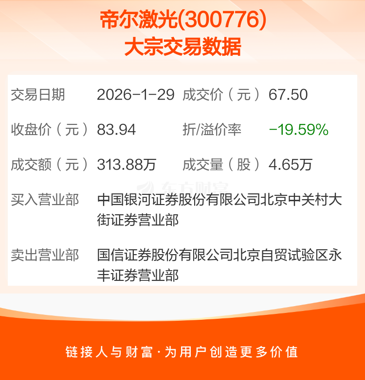 2026年1月29日,帝尔激光发生1笔大宗交易,共成交4.65万股,成交金额313.88万元,占其流通市值比例为0.02%。
