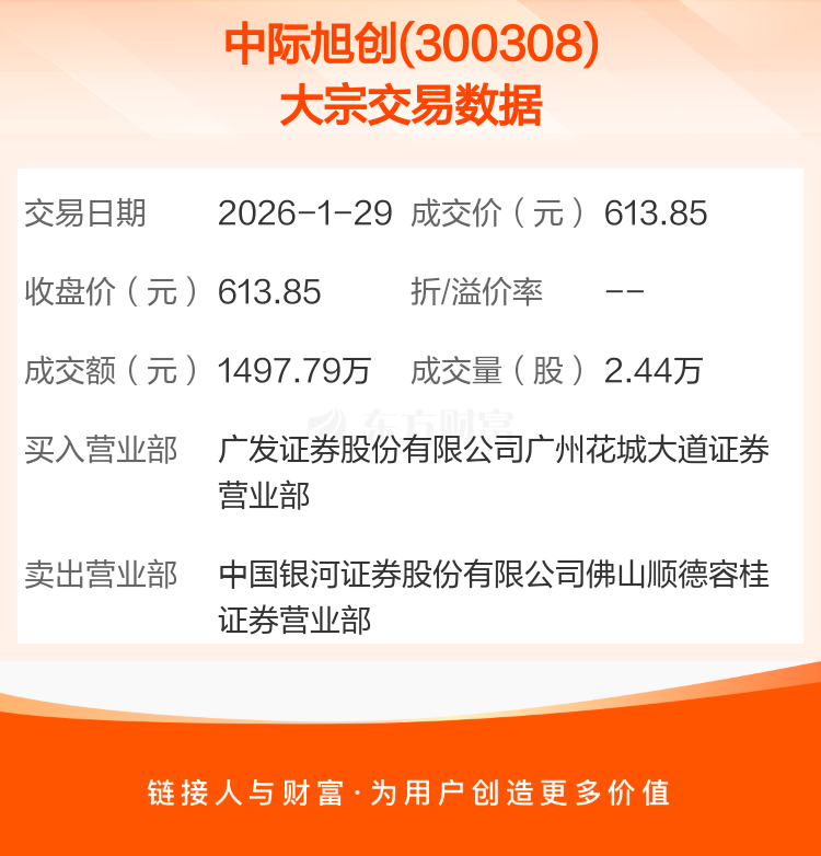 2026年1月29日,中际旭创发生1笔大宗交易,共成交2.44万股,成交金额1497.79万元。