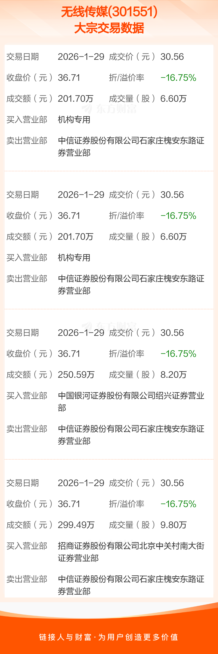 2026年1月29日,无线传媒发生4笔大宗交易,共成交31.20万股,成交金额953.48万元,占其流通市值比例为0.17%。