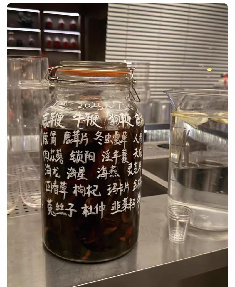 从该卖家展示的照片可以看到,其自泡鹿鞭酒装在一个大玻璃瓶中,酒体呈红棕色,隐约可见其中泡制的各种原料。瓶身则用白色手写字体标上浸泡时间,以及鹿鞭、牛鞭、狗鞭、鹿筋、鹿肾、鹿茸片、冬虫夏草、人参、肉苁蓉、淫羊藿、海龙、枸杞、玛卡片、菟丝子、韭菜籽等20多种原料名称。